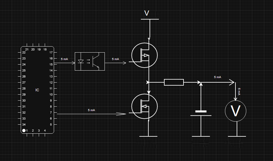 - przewodzi tranzystor górny typ (P) i wtedy przez opornik ładowany jest akumulator