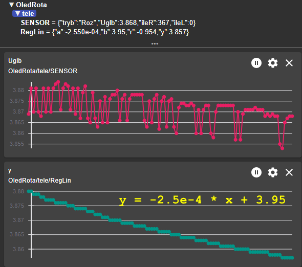 Pomiar jaki przedstawiono na wykresie pochodził bezpośrednio z ADC jaki posiada wewnętrznie ESP8266 (pin A0). Bez matematycznej metody najmniejszych kwadratów funkcjonowanie projektu testera wypadało marnie. Po zastosowaniu układu ADS1115 otrzymałem rewelacyjnie dokładne i gładkie pomiary napięcia jak z najlepszego multimetru laboratoryjnego. Co ważne driver tego układu zawarty w firmware LUA ma kalibrację i daje odczyty bezpośrednio w mV.
